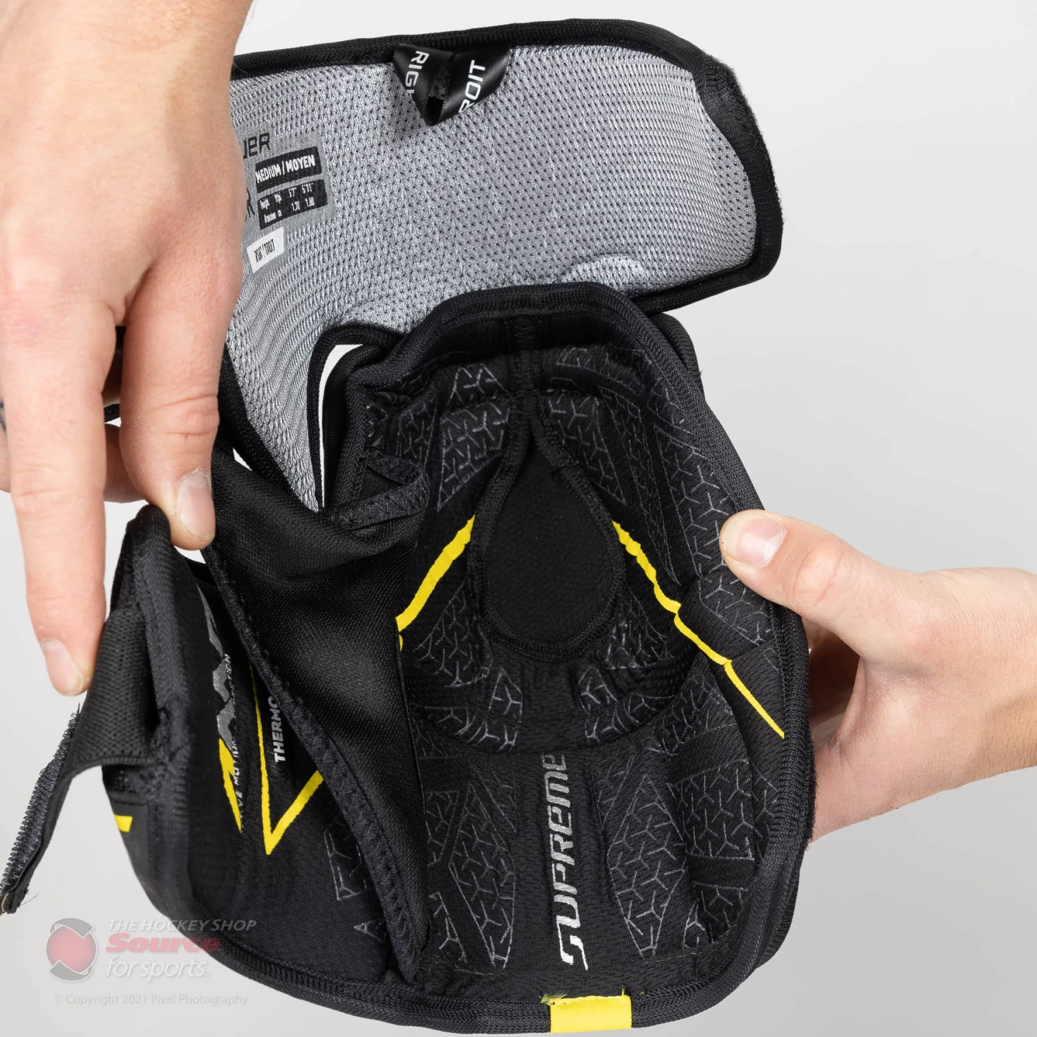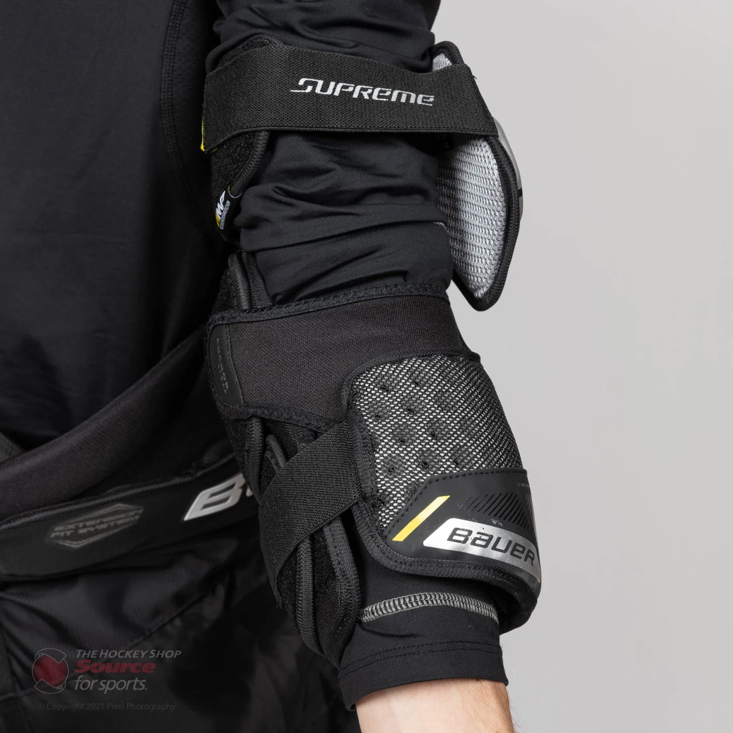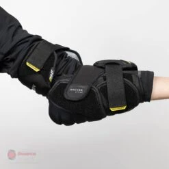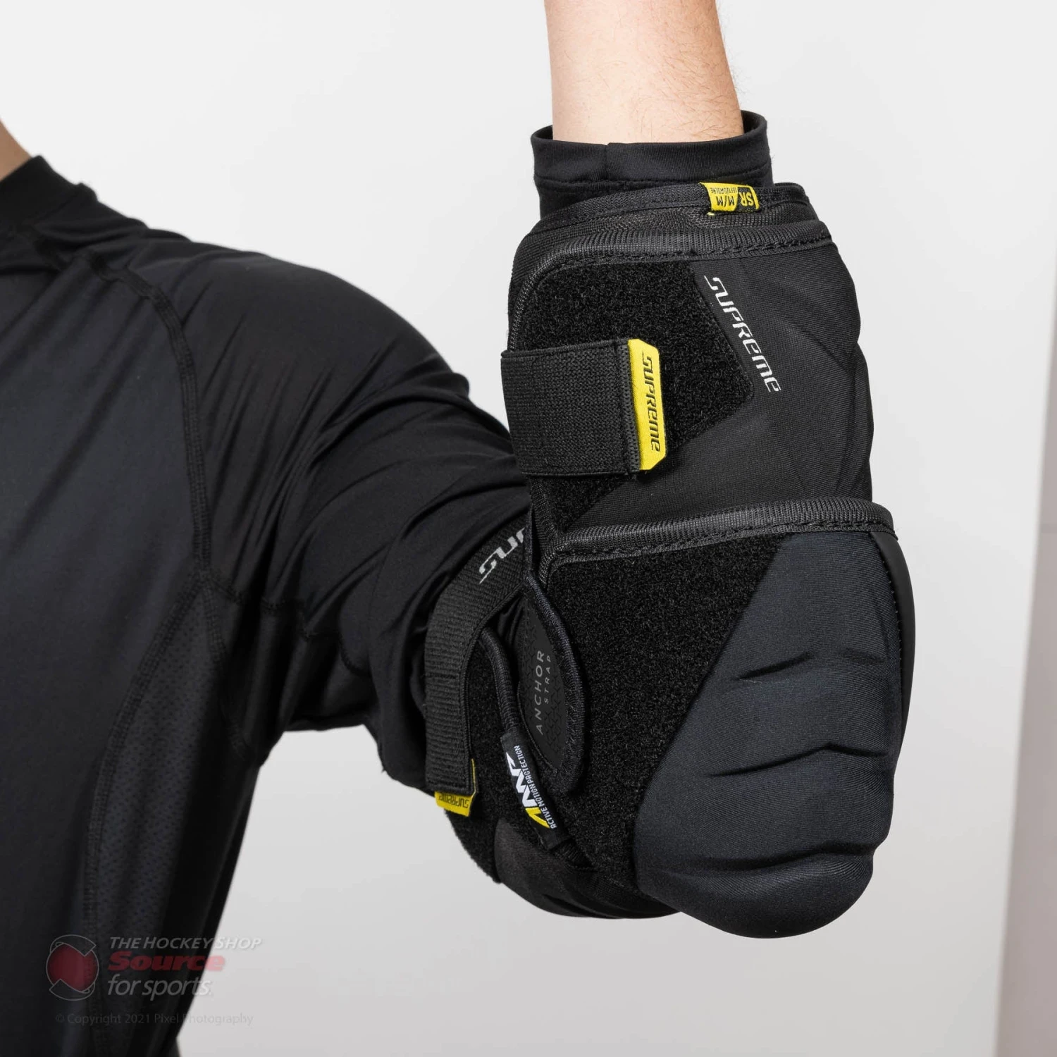 The Supreme 3S Pro has 3 separate straps. Firstly, the Anchor Strap that wraps directly onto the top of the forearm. The anchor strap is extremely comfortable and stretches to your preference. Secondly, the forearm strap that locks the 360 forearm molded protection overtop of the forearm and lastly, the third strap holds the 360 bicep protector in place covering the soft spots where you are most susceptible to slashes and crosschecks.