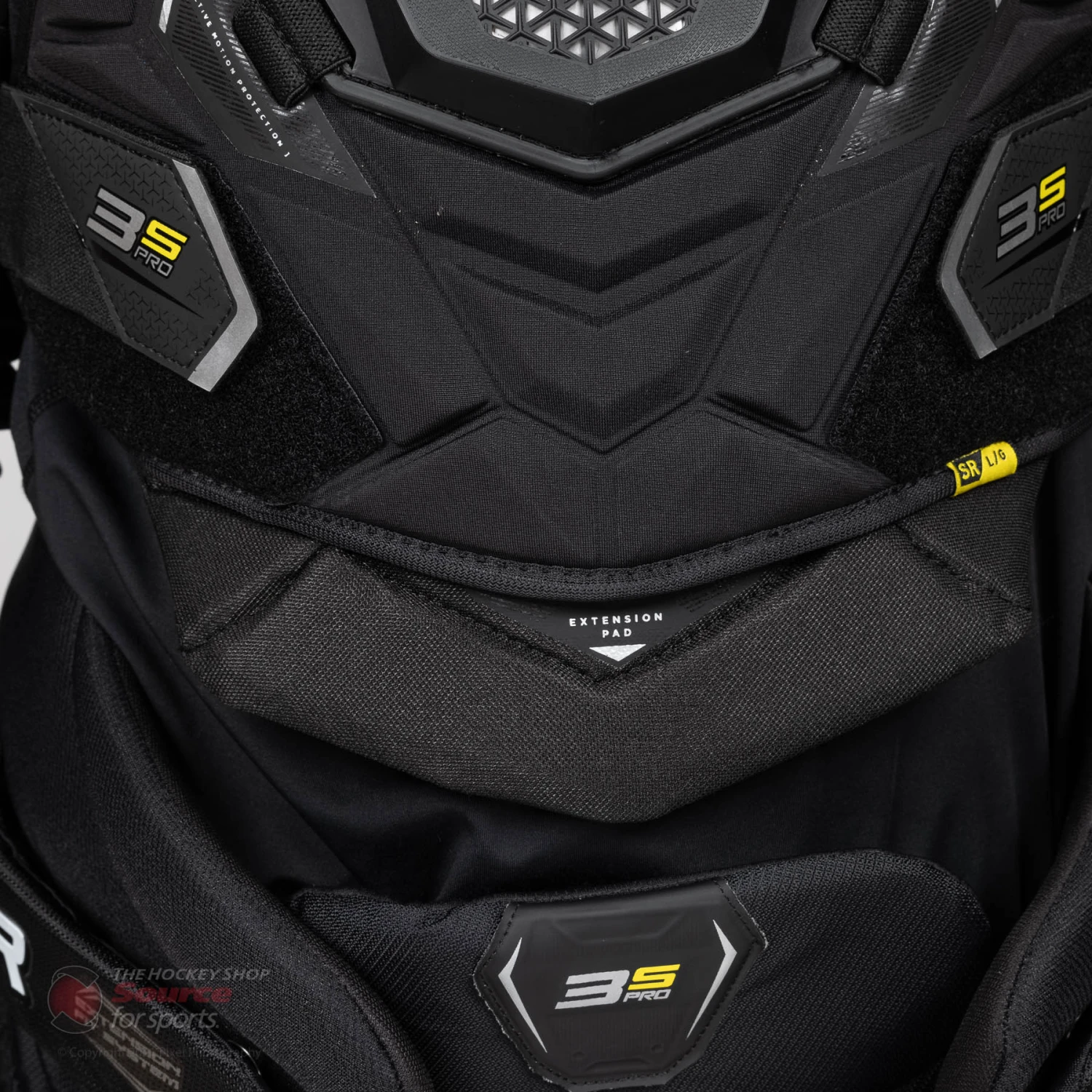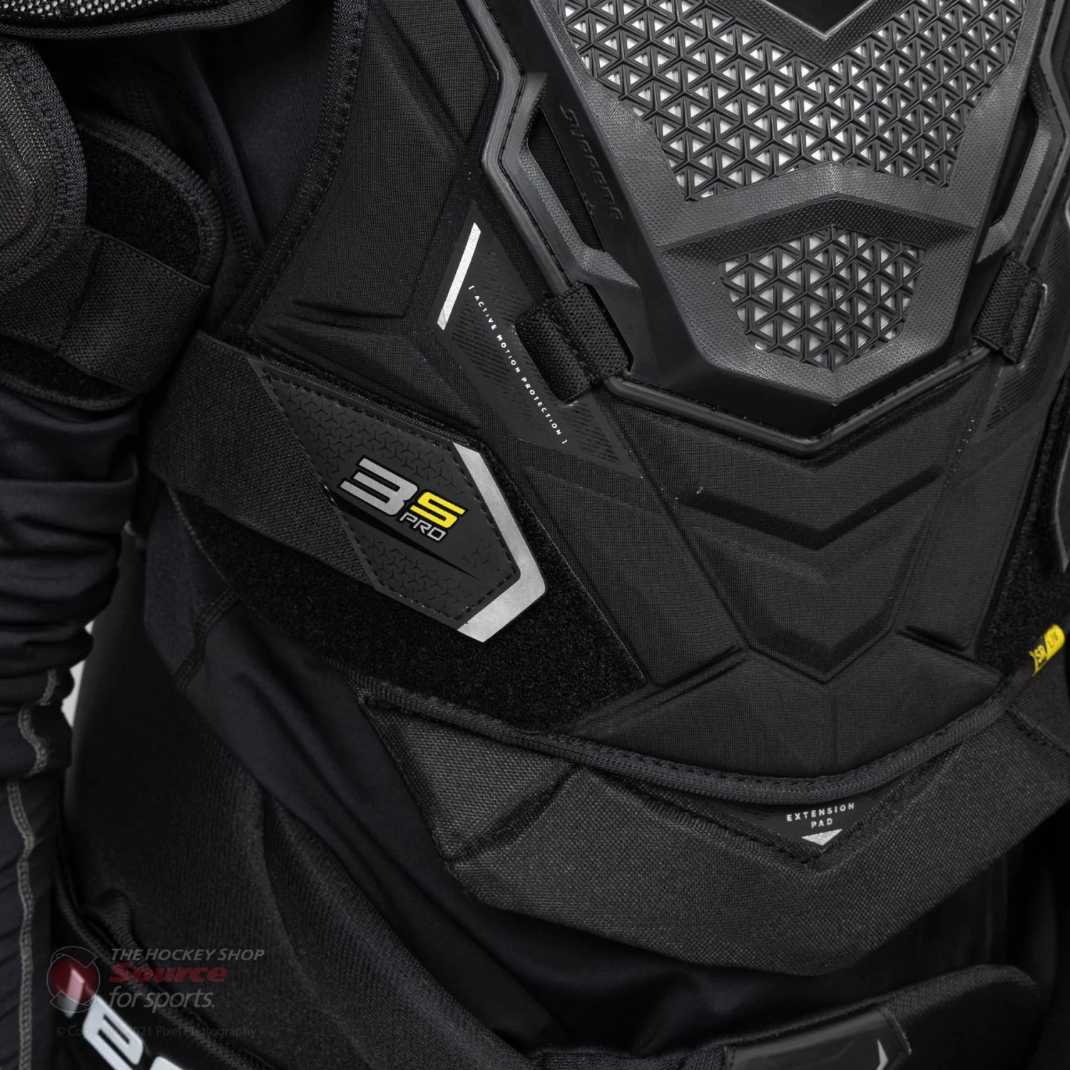 The 3S Pro shoulder pad features an adjustable split bicep. The AMP technology design within the bicep pieces has no restriction in movement and allows you to have a full range of motion on the ice.