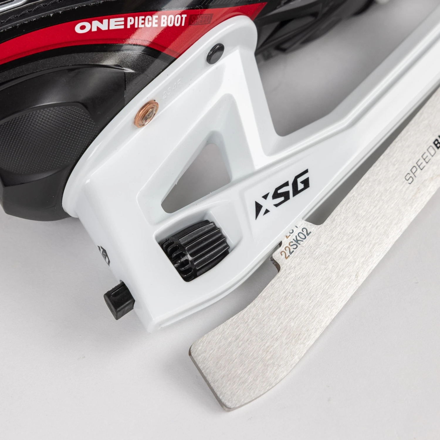 The skates use CCMโs quick-release Speedblade XSG holder with a bladelock system, coupled with Speedblade XSG 10F27. This runner offers a durable edge that sustains performance over time, and its innovative 10F27 profile additionally promotes a forward-leaning goalie stance.