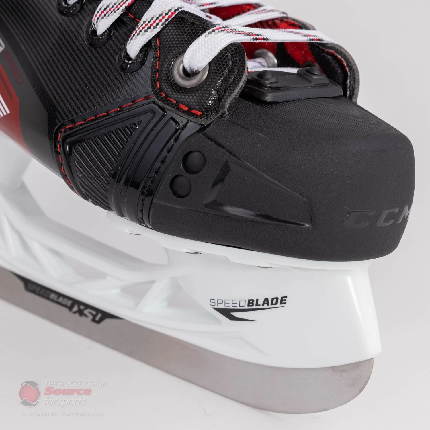 The CCM Jetspeed FT4 Junior Hockey Skate is a performance elite level skate. The FT4 offers many of the same features and performance in a more affordable package. The One-Piece Boot and the CCM XS quick release holder are both standard on the skates. CCM is now offering Step Stainless steel stock with their FT4 models. Also new to the FT4 is the asymmetrical toe cap that reduces the amount of empty space in the boot, focusing on optimizing energy transfer through the boot.