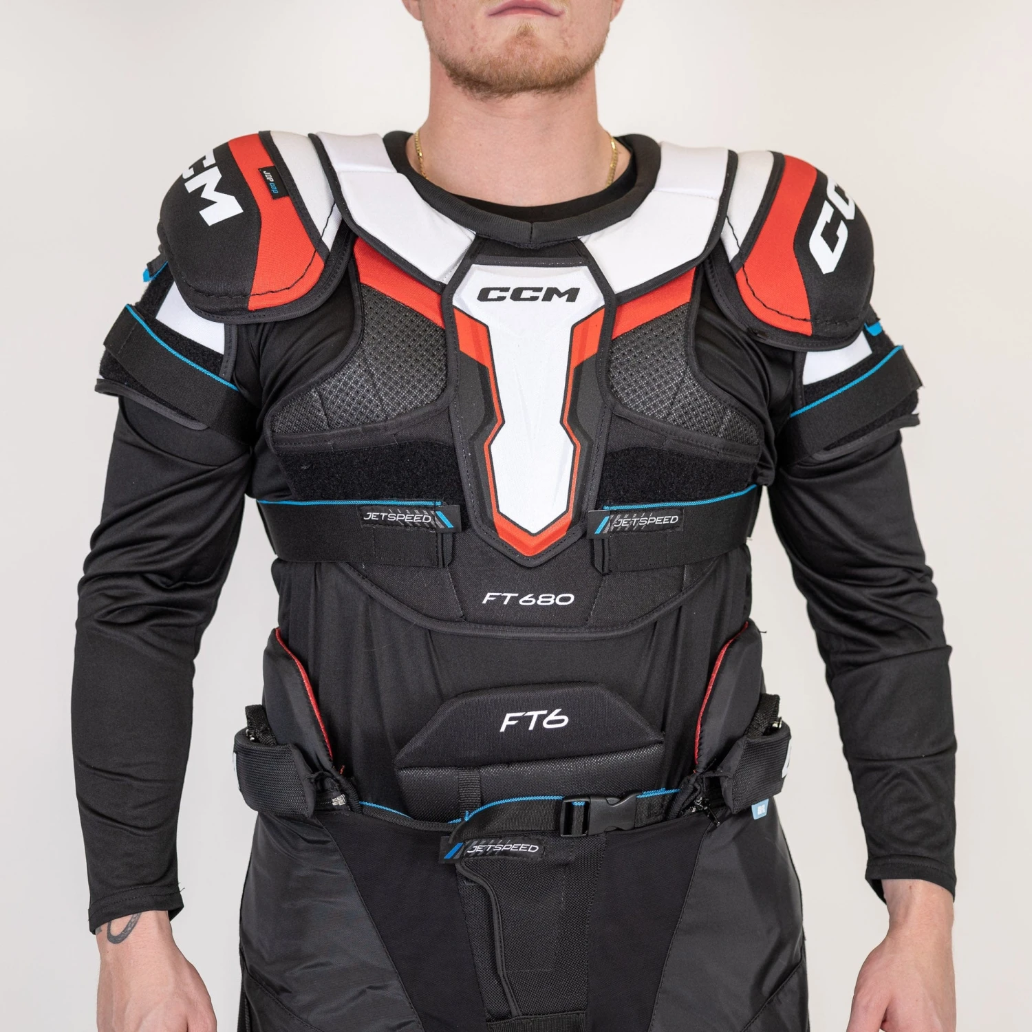 CCMโs next shift in focus for 2023 is in the new Jetspeed FT6 line. The Jetspeed FT 680 is a more affordable option for the recreational player whoโs still looking for a low-profile look, good flexibility in their gear, and high-level protection. These shoulder pads feature dual-layer front construction, JDP design caps, a vented front base, and additional coverage in both the front panel and clavicle areas.