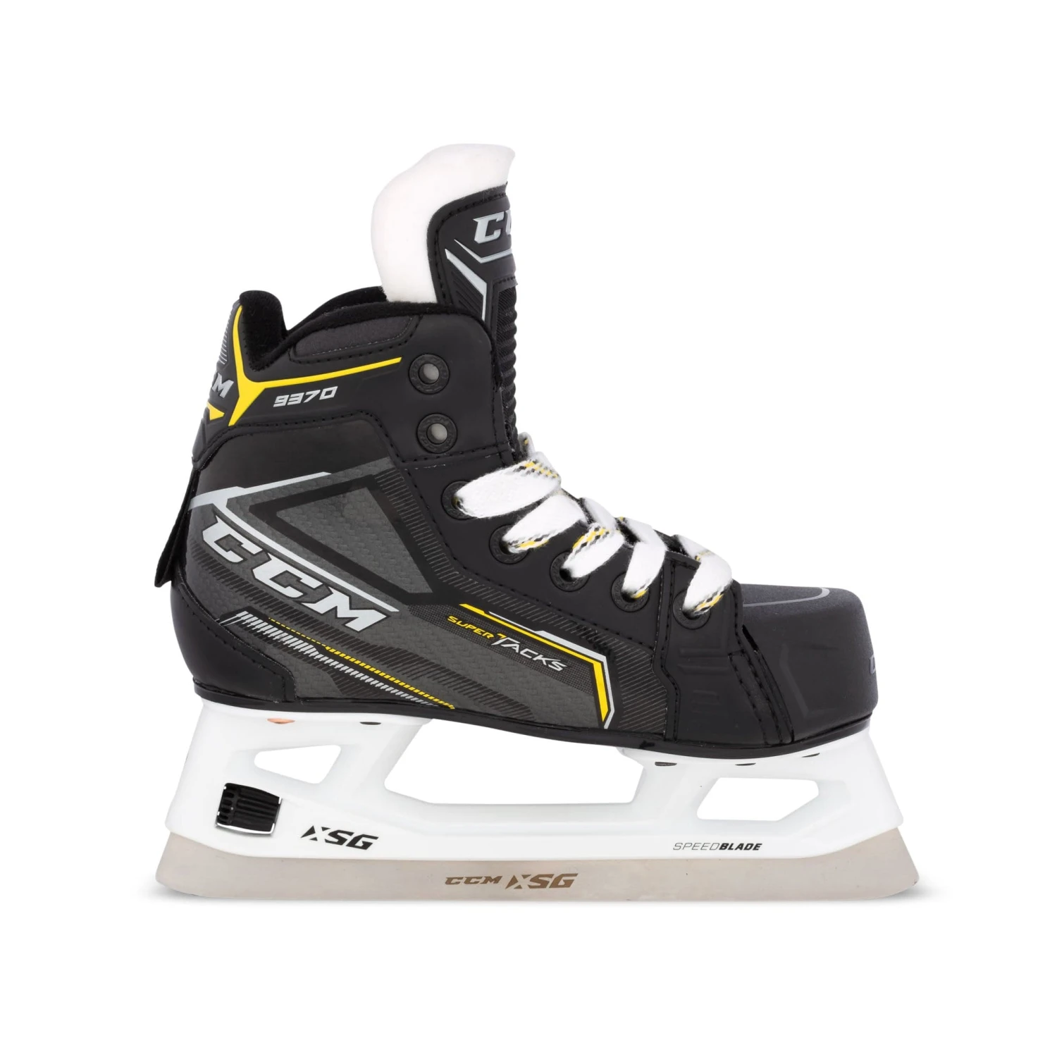 The CCM Super Tacks 9370 YTH Goalie Skates are designed with the recreational level goalie in mind. CCM features an injected technology design with a synthetic composite boot construction, giving goalies a durable boot with good structural stiffness. An asymmetrical collar allows goalies to get deep in their stance while a thermoformable core allows goalies to get a better fit than before. A brushed microfiber liner provides a comfortable fit, and a felt tongue that protects against lace bite and providing comfort. CCM fit system insoles give goalies good support and comfort while locking your feet into the skates. Finally, the XSG1 stainless steel runner gives the blades excellent edge life while standing taller than previous generation CCM steel.
