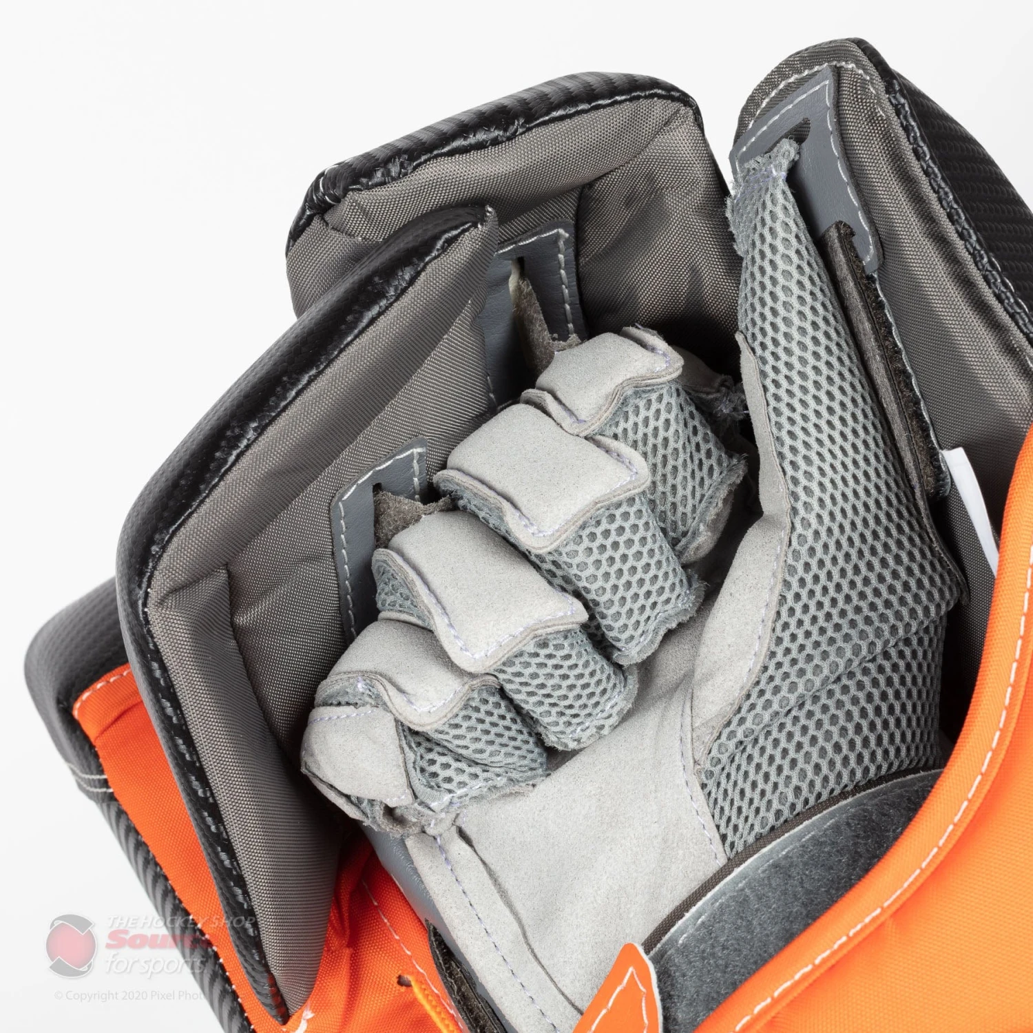 The side board of the blocker features ample finger protection, designed to fit the goal stick without any weak spots or interference.